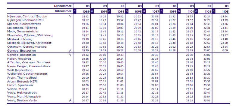 Voor lijn 83 geldt dan als eindpunt Gennep (als dit de eindhalte zou zijn), Nijmegen of Venlo.